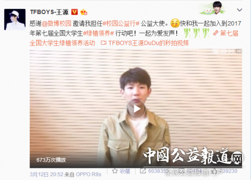俗话说“少年强则国强”,近期00后优秀青年代表王源真是正能量满满!年初受联合国邀请,王源作为中国优秀青年的代表参加联合国的会议,倡导“优质教育”,并在会议中全程英文发言赢得国内外一致好评。回国后,与胡歌、赵丽颖共同加入“做文明游客,为中国加分!”活动。提倡文明旅游后,王源此次再次发声,少年秉承着长久以来对公益的热爱,再次献身公益,担任#校园公益行# “校园公益大使”,号召大家号召大家加入共青团中央及微博校园、微公益联合举办的2017年第七届全国大学生绿植领养活动,呼吁大家守护身边的绿色,为爱发声。