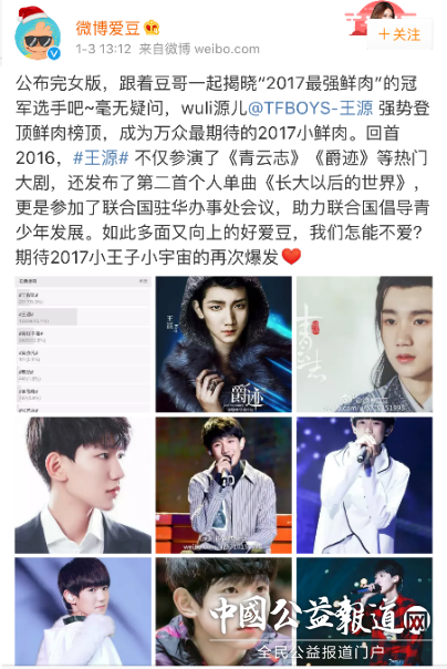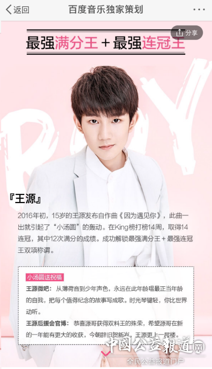 除此之外,王源的2016也收获颇丰,音乐、影视、主持多面开花,接连拿下新浪微博“最具传播力TOP1”、百度King榜2016年度“最强满分王+最强连冠王”、微博电影“2016年度粉丝最爱电影明星”、新浪微博“2017最强鲜肉”等多项荣誉称号。