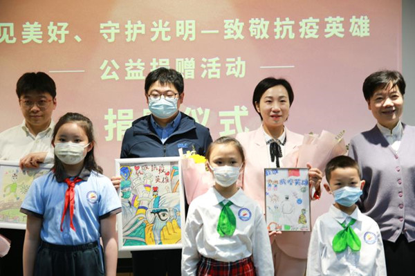 公益活动邀请了从武汉归来不久、刚刚解除医学观察隔离的4位上海盟员医务界英雄。捐赠仪式上,援鄂医疗队员代表还每人收到了一幅绘画作品。这份特殊的礼物全部出自闵行区的小学生之手,虽然画笔稚嫩,但是饱含深情。