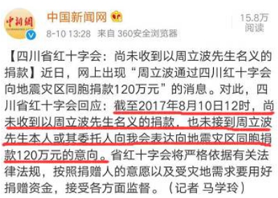 因个人形象受损的周立波也遭遇了周立波式尴尬!8月10日9点03分,周立波发布微博称“已通过四川红十字会向地震灾区同胞捐款120万元”。随后有记者连线采访四川红十字会,对方回应尚未收到周立波捐款。