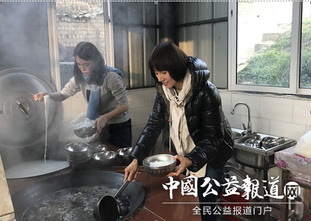 27日清晨7点不到,天还没大亮,@孔维和@袁泉就出现学校的厨房里,史上最长的公益直播便就此拉开了帷幕。她们亲手为孩子们烹饪了热腾腾的“饵丝”早餐,然后和孩子们一起上音乐课、学英语和做手工,还展开了一场特别的课间操。