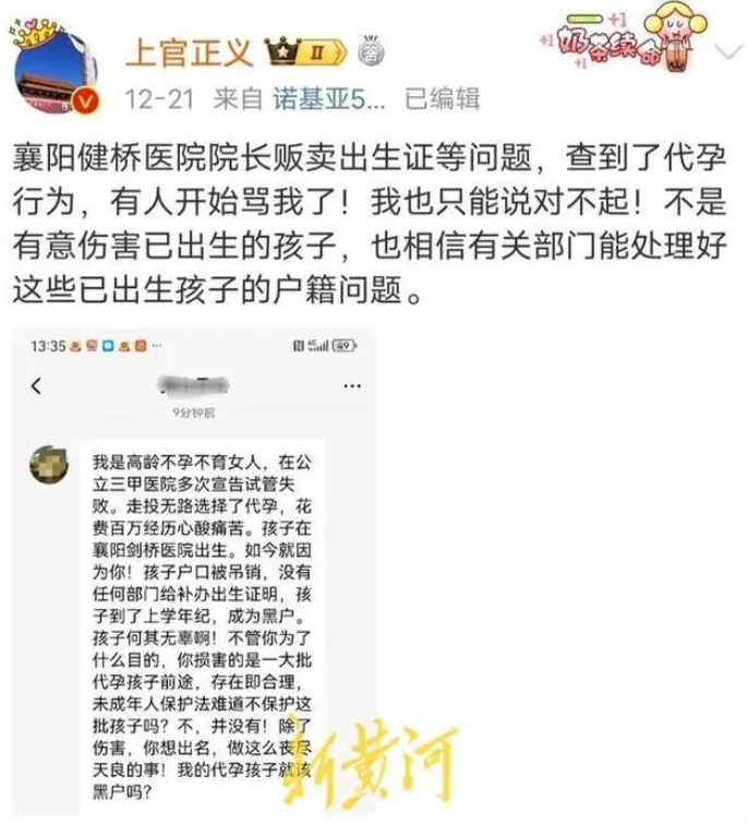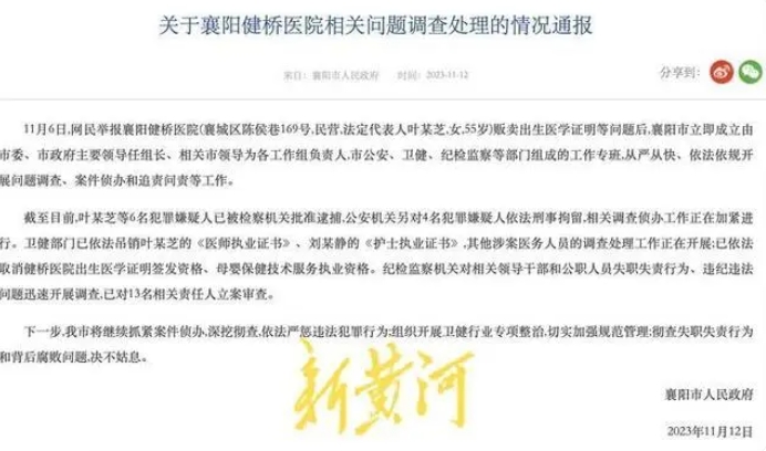 11月6日,上官正义在社交平台举报湖北襄阳健桥医院涉嫌贩卖出生证明,并称经过一年多的暗访发现,襄阳健桥医院院长叶某芝勾结多地中介团伙,利用社交平台公开发布办理出生证信息,物色客户,贩卖出生证明、疫苗本等。11月12日,襄阳市发布情况通报,叶某芝等6名犯罪嫌疑人已被检察机关批准逮捕。