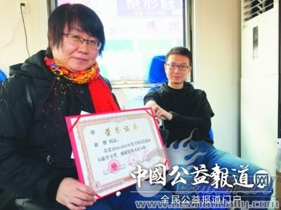 ?牐犜谙籽?车上,记者看到一位中年获奖女士与一个正在献血的年轻人聊得正起劲儿,一问才知道他们是一家人,“这是我带来的献血生力军。”说话的人名叫赵替,家住德州经济技术开发区长河街道东七里铺邮电小区今年50岁,无偿献血已经有十五六年了,这次带着儿子一块过来领奖,儿子赵冠一当天还献了血。