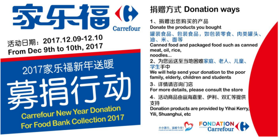 自1994年开始,家乐福基金会便与食品银行合作,每年会定期组织捐赠,为弱势群体提供膳食支援。2013年,家乐福基金会决定将“食品银行”公益活动推送至家乐福全球各国门店,活动吸引了10个国家的重点城市如北京、巴黎的成千上万名志愿者积极参与。从2014年起,家乐福中国在国内60余家门店举行食品银行活动,至2017年已是第三个年头。