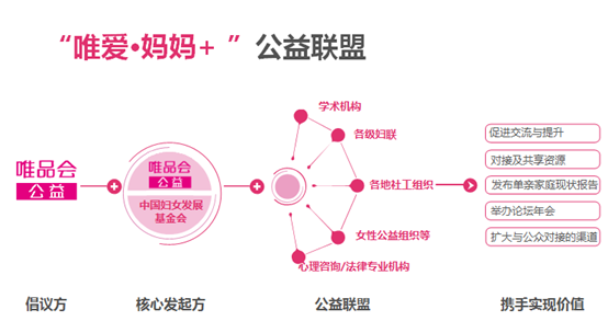 唯品会关注到单亲妈妈群体的需要,特别推出“唯爱•妈妈+幸福赋能计划”,围绕着群体的各方面需求推出包括心理与法律支持、职业发展、亲子教育、健康保险以及社群互助等服务。同时,唯品会一如既往,积极探索“互联网+公益”的创新模式,在APP“我的公益”将特别设立“唯爱妈妈+”线上信息平台,为有需要的妈妈提供各方各面的资讯与服务。