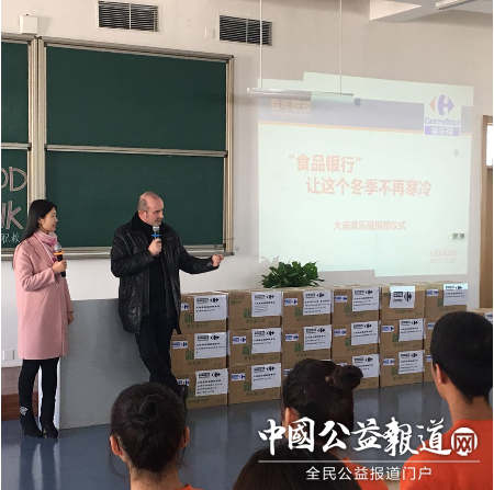 继12月9日大连家乐福启动2017食品银行募捐活动后,爱心消费者参与此项活动热情一直未减。12月20日,家乐福辽南区区长包松先生、家乐福东北区公关事务总监孔令昕等带领家乐福爱心团队来到了位于金普新区石河街道的大连百年职校,把募捐而来的米面油等爱心商品送给这里的学生们,受到了老师和同学们的热情欢迎。