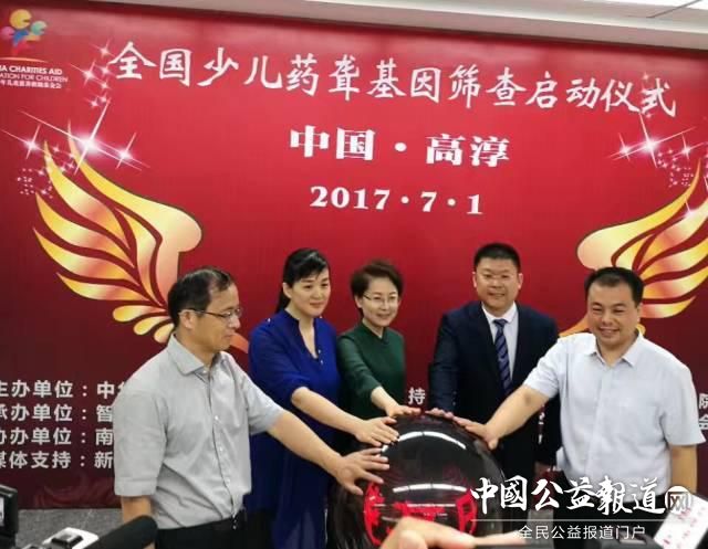中华儿慈会秘书长助理兼9958救助中心总监王昱(左二)和9958爱无声慈善公益基金发起人曾祥宽先生(右一)启动2017年高淳全国少儿药聋基因筛查活动