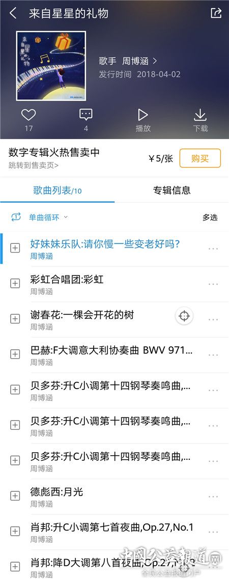 早在2017年周博涵就在酷狗音乐上发布了自己的首张数字音乐专辑《听见星星的声音》,当时就受到了网友们的好评,如今第二张专辑的发布不仅让人们看到一个自闭症患者的才华天赋,也让人们感受到酷狗音乐在公益道路上的努力不懈。
