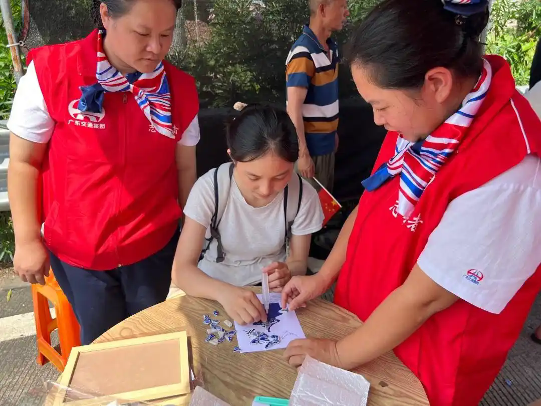 在茂湛高速浅水站服务点,志愿者准备了非遗陶瓷画活动。旅客用青花瓷碎片巧手拼贴出“喜迎国庆”“红船精神”“盛世华诞”等主题陶瓷画,尽显青花瓷典雅之美,更真切感受到变废为宝、绿色循环之乐。